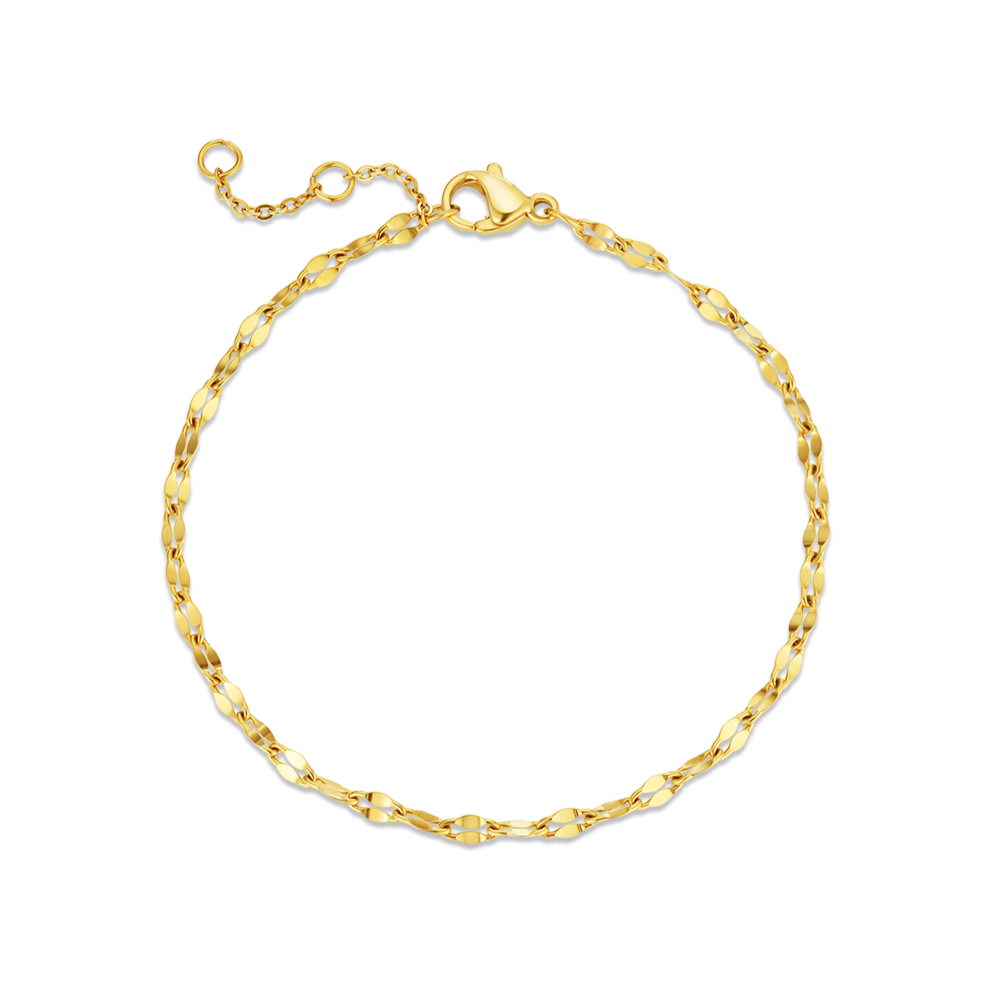 Named after the Italian word for kiss, the Baccio Bracelet features smooth, lip-shaped links that connect in a fluid, sculptural rhythm. Delicate and lightweight, the dainty chain catches the light with every move — a subtle nod to affection, expression, and effortless style.