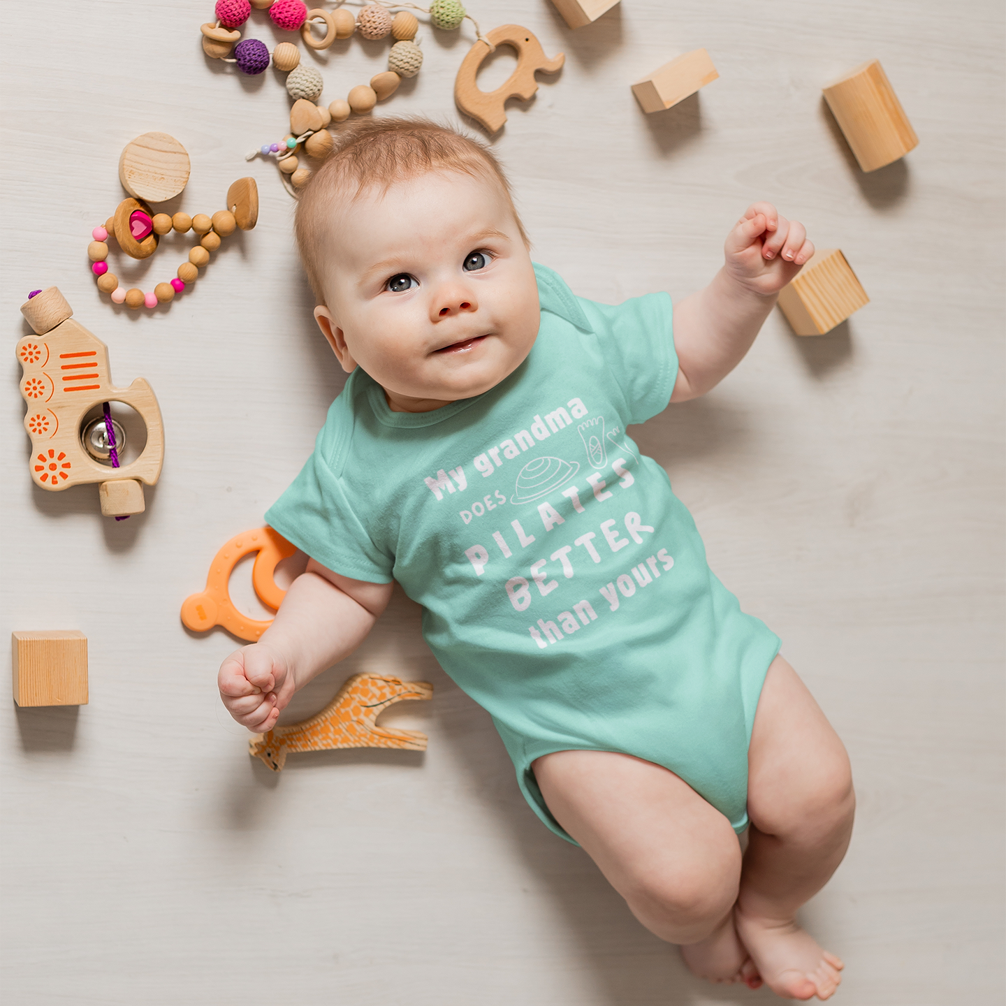 Strong, graceful, and always on point—just like Grandma! This adorable chill green baby bodysuit features the fun phrase “My Grandma Does Pilates Better Than Yours,” making it a playful and stylish outfit for little ones with Pilates-loving grandmas.