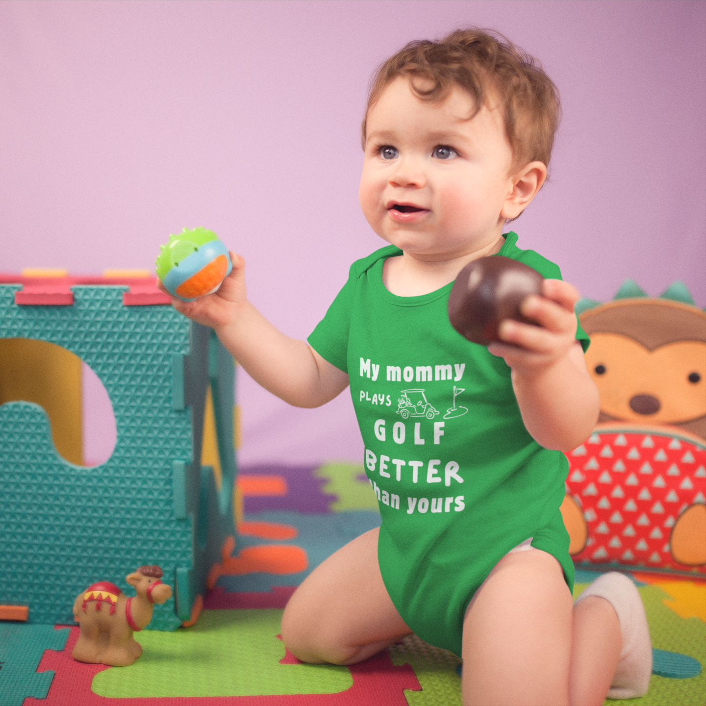 Got a golf-loving mama who can crush it on the course? Let your little one show her off in this adorable green baby bodysuit! With the fun and cheeky phrase “My Mommy Plays Golf Better Than Yours,” this one-piece is a hole-in-one for sporty families with a sense of humor.