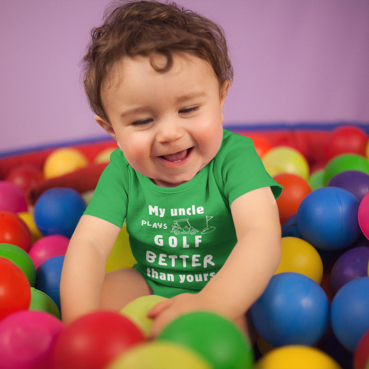 Celebrate the coolest uncle on the course with this fun and sporty green baby bodysuit! Featuring the phrase “My Uncle Plays Golf Better Than Yours,” it’s perfect for babies with proud, golf-loving uncles.