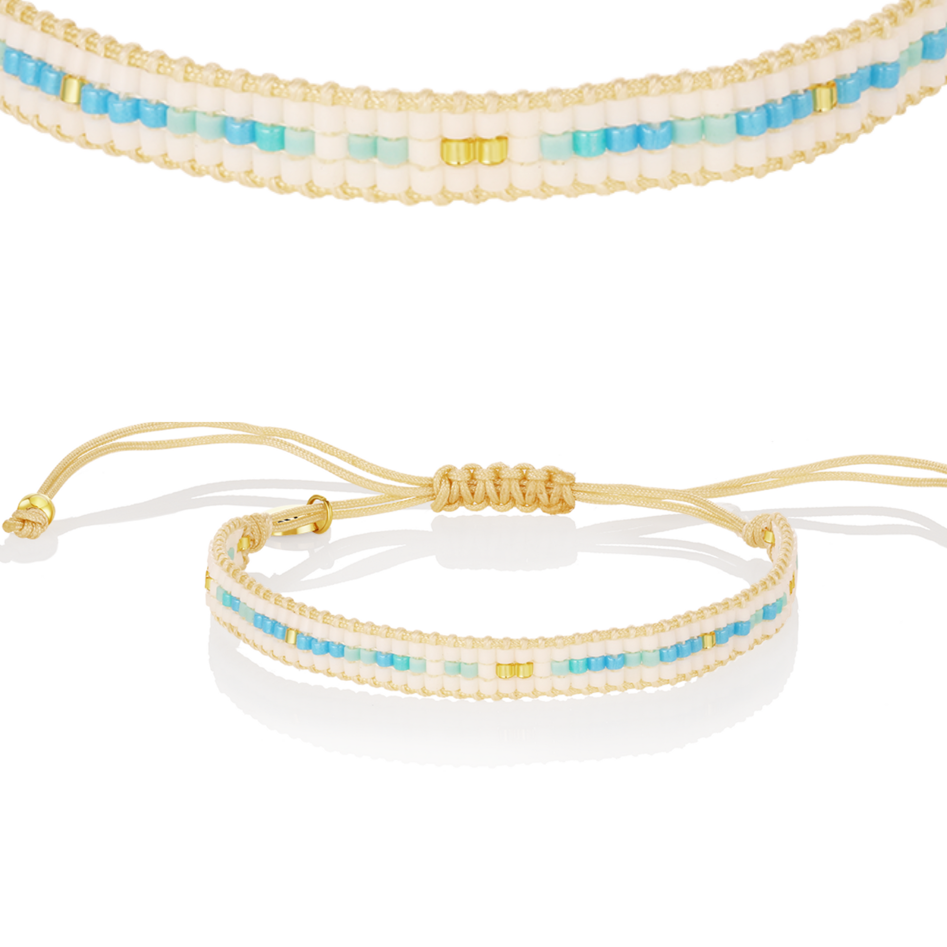 The Salty Bracelet channels the essence of sun-drenched shores and salty breezes with a mix of deep blue, sandy white, and golden-toned beads in a sleek woven design. Like the shimmer of light on waves, it brings laid-back beach energy to your everyday look. Lightweight and adjustable, it’s made for adventures—by the water or wherever your soul feels free.