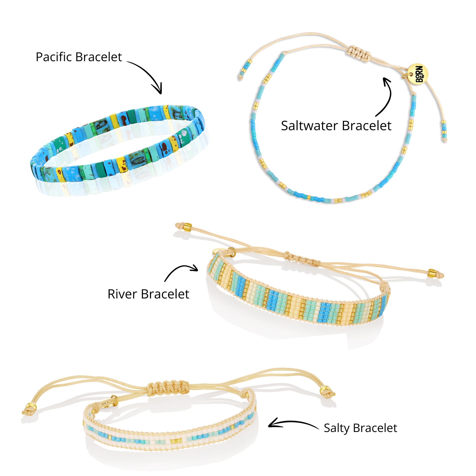The Sea Breeze Stack features four handmade beaded bracelets in soothing shades of ocean blues, crisp whites, and soft neutral tones β a perfect mix of coastal calm and beach-day energy.