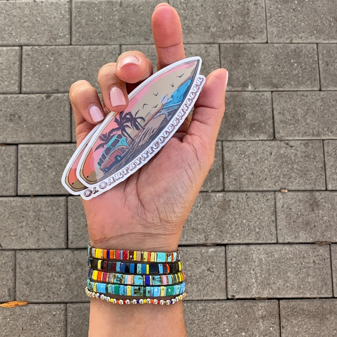 Introducing the Born to Rock Jewelry x Nicole Miller Surfboard Sticker – a dynamic fusion of surf culture and artistry. This exclusive collaboration captures the essence of Nicole Miller's original surfboard paint in a unique sticker. Perfect for surf enthusiasts and beach lovers, this durable sticker brings coastal vibes to any surface. Dive into the waves with the Born to Rock Jewelry x Nicole Miller Surfboard Sticker – a vibrant touch of ocean-inspired art for your everyday adventures.