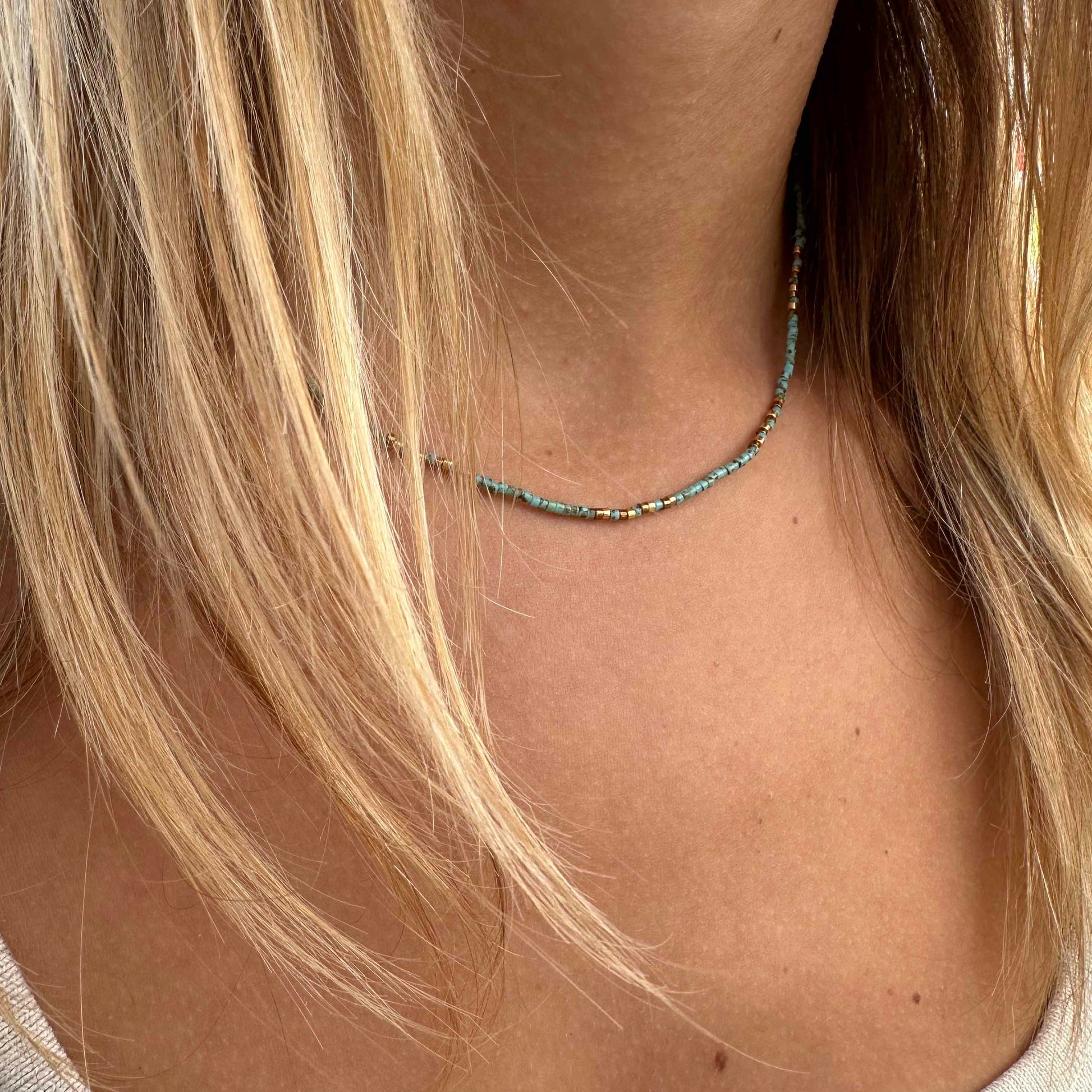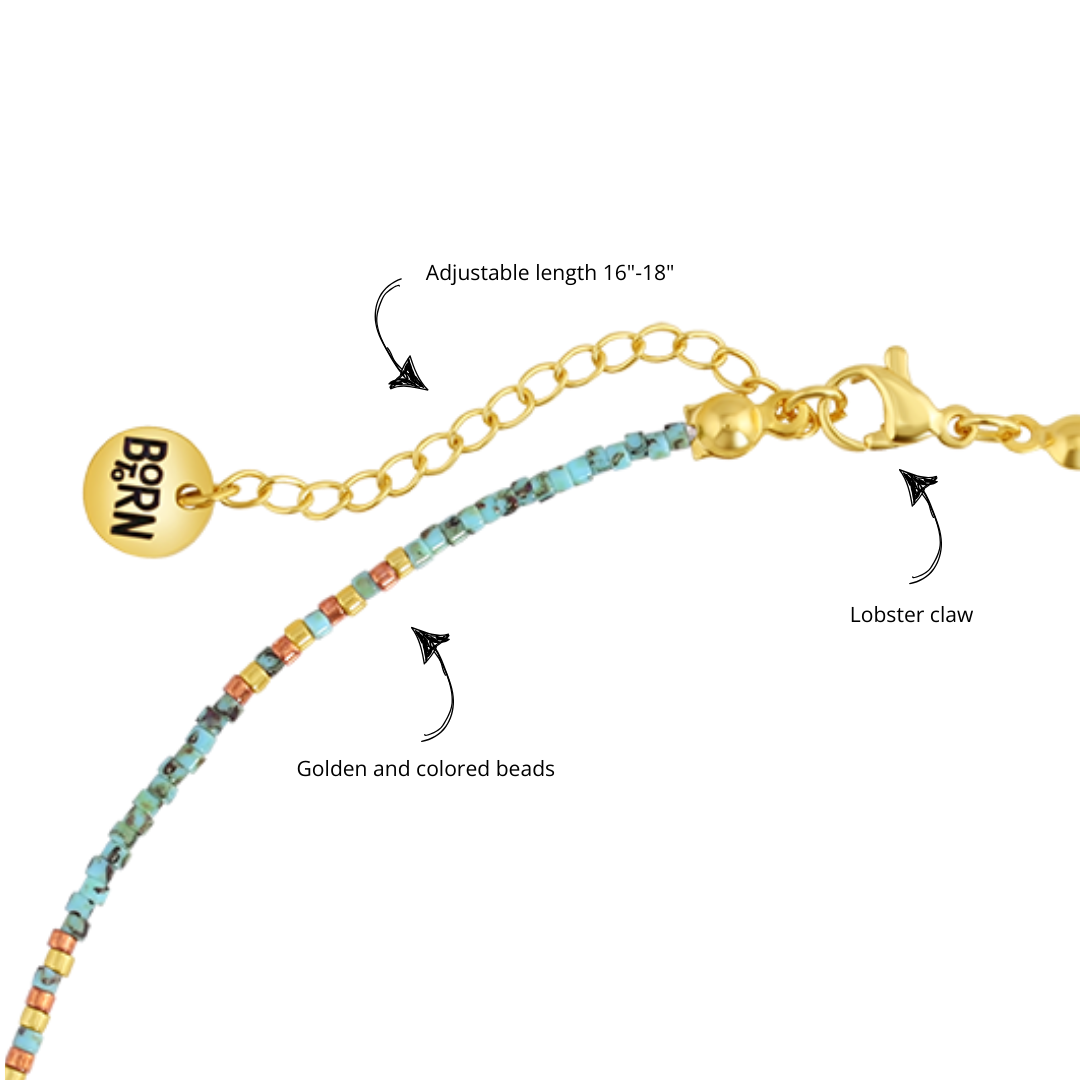 - Style: Dainty necklace, colored beads, beaded necklace, surf jewelry, beach vibes.