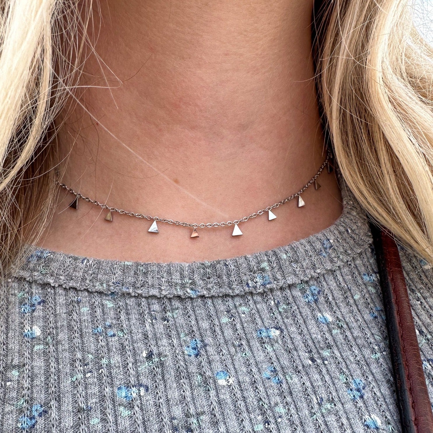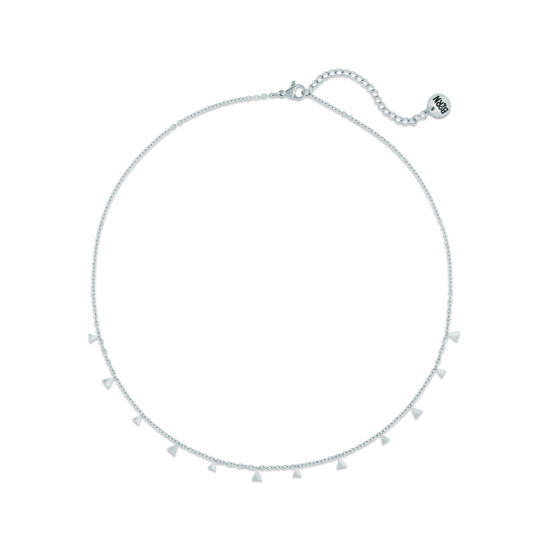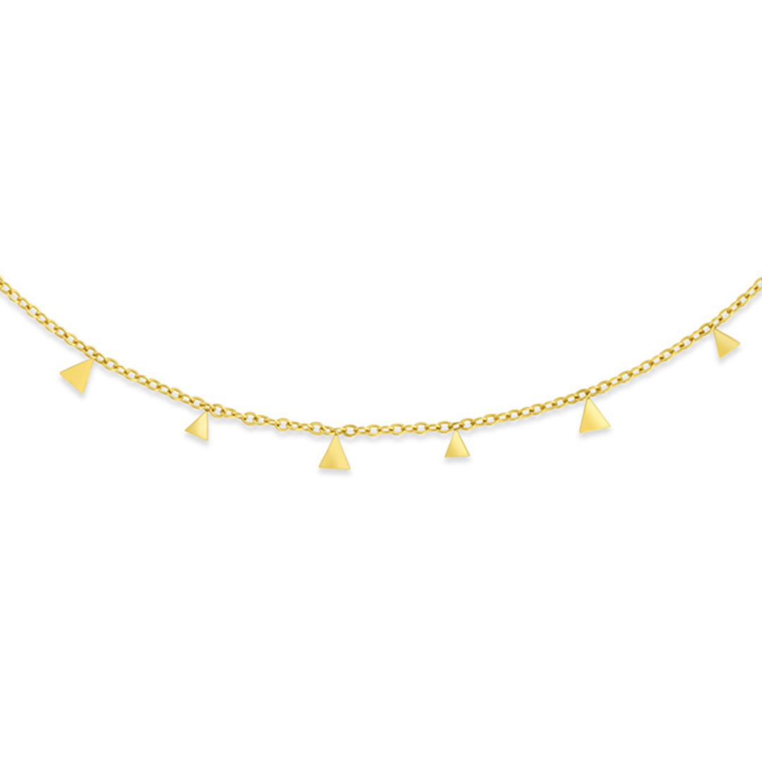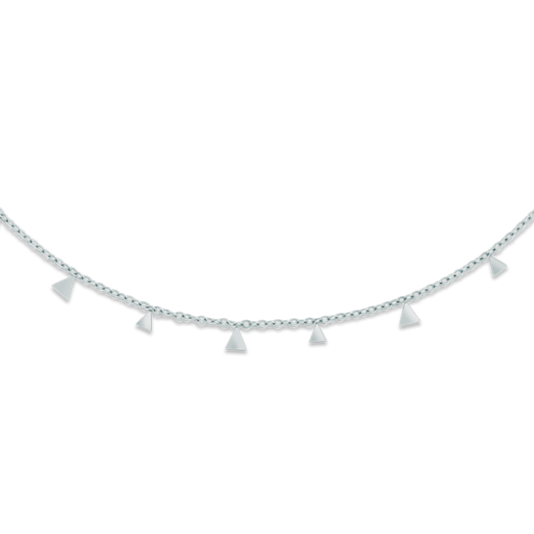 This necklace features a series of tiny, shimmering triangles that create a captivating interplay of light and movement. The adjustable chain ensures a perfect fit, allowing you to customize the length according to your preference.
